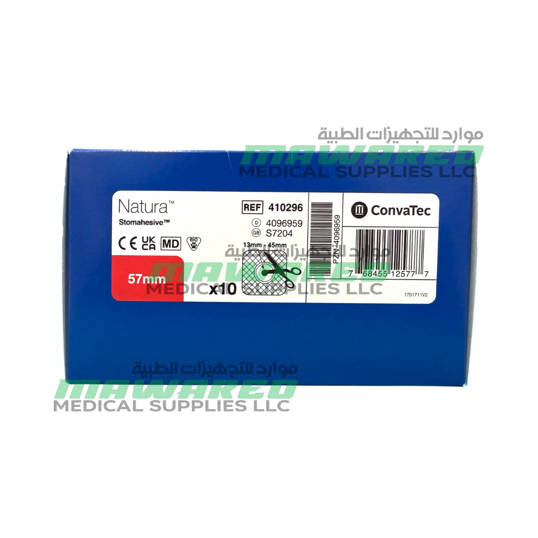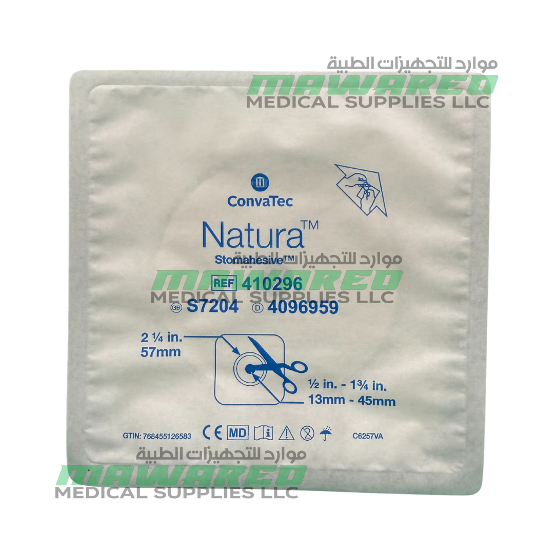 The ConvaTec Natura Base Stomahesive 57mm (410296) is a reliable 2¼” cut-to-fit skin barrier (wafer) for the SUR-FIT Natura system, designed for secure and comfortable ostomy management. It features a durable plastic coupling ring that allows the pouch and wafer to snap together with audible confirmation for added security.